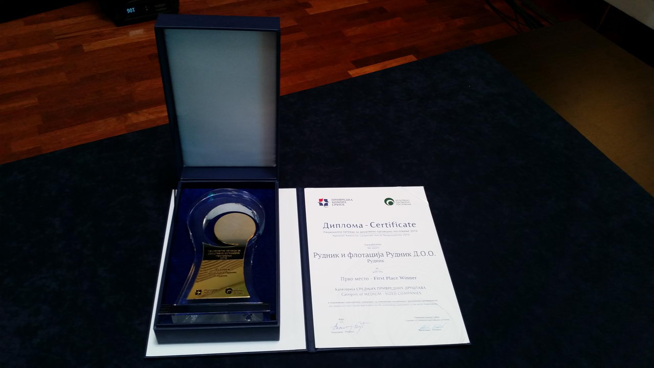 Within the sixth cycle of award of the “National prize for socially responsible business”, which is organized and awarded by the Chamber of Commerce of Serbia, at the award ceremony that took place on 10 April, the company Rudnik i flotacija Rudnik doo was awarded the first prize in the category of medium-size companies (Public Utility Company “Housing Affairs” of Belgrade, Hyatt Regency).