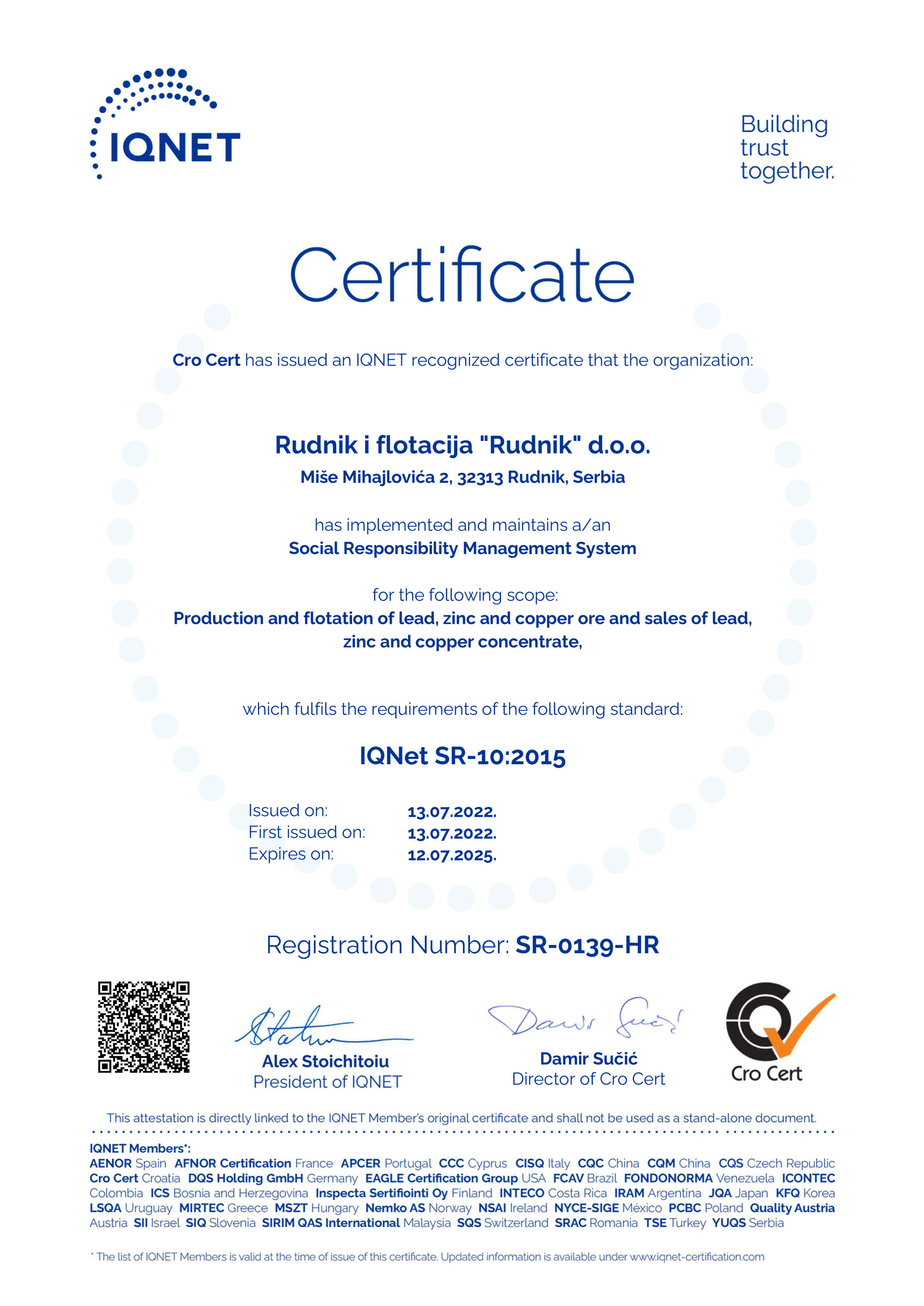 15. jula, posle 3 godine od uvođenja sistema upravljanja društvenom odgovornošću IQNET SR 10 izvršena je resertifikacija standarda. Sistem je resertifikovan bez neusaglašenosti a provera je rađena od strane sertifikacionog tela CRO CERT, akreditovanog u EU.