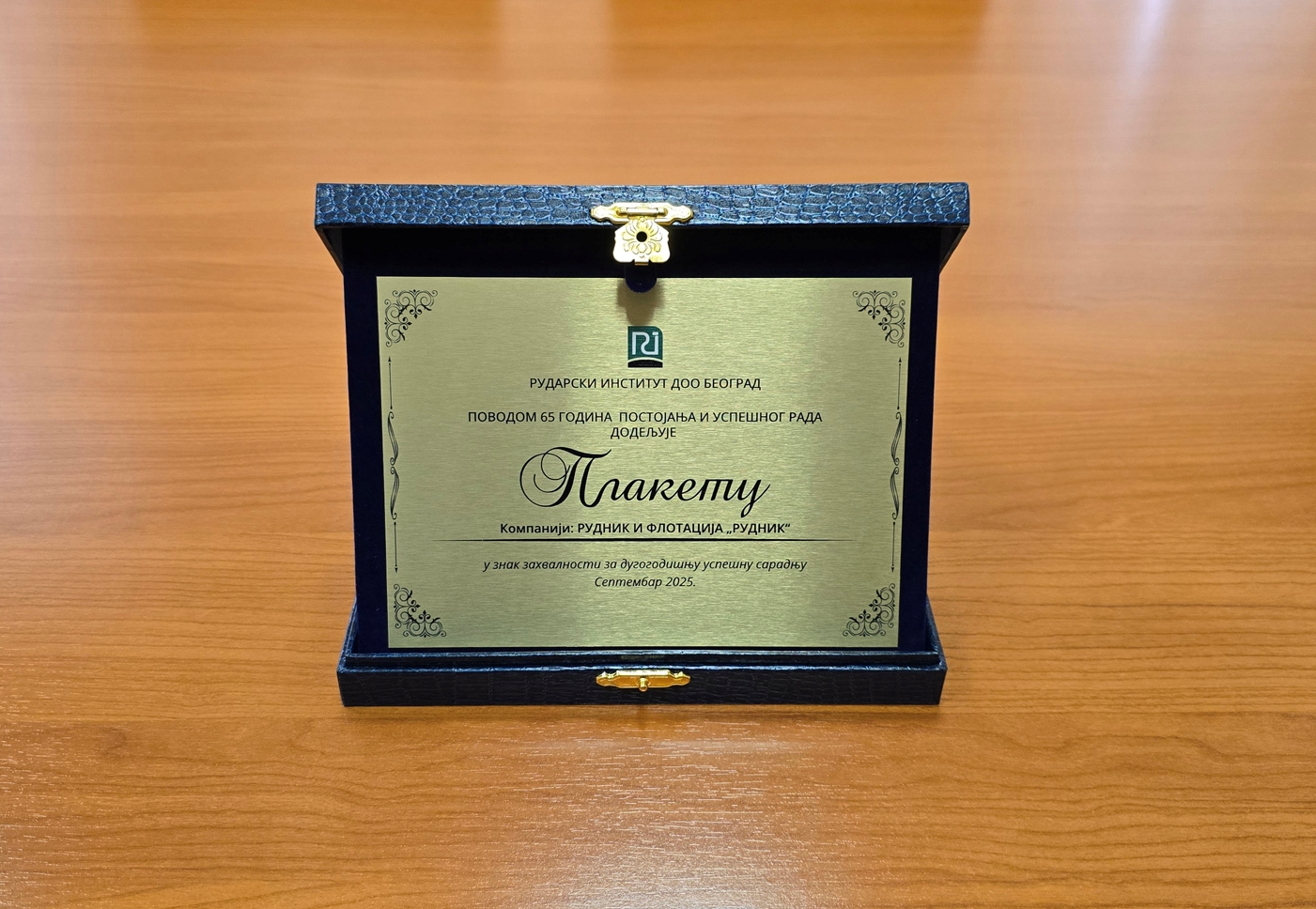 U petak, 26. septembra, na proslavi povodom 65 godina postojanja i uspešnog rada Rudarskog instituta, tokom Svečane akademije uručena je plaketa privrednom društvu Rudnik i flotacija Rudnik doo u znak zahvalnost za dugogodišnju uspešnu saradnju. Plaketa je uručena generalnom direktoru, Aci Iliću.